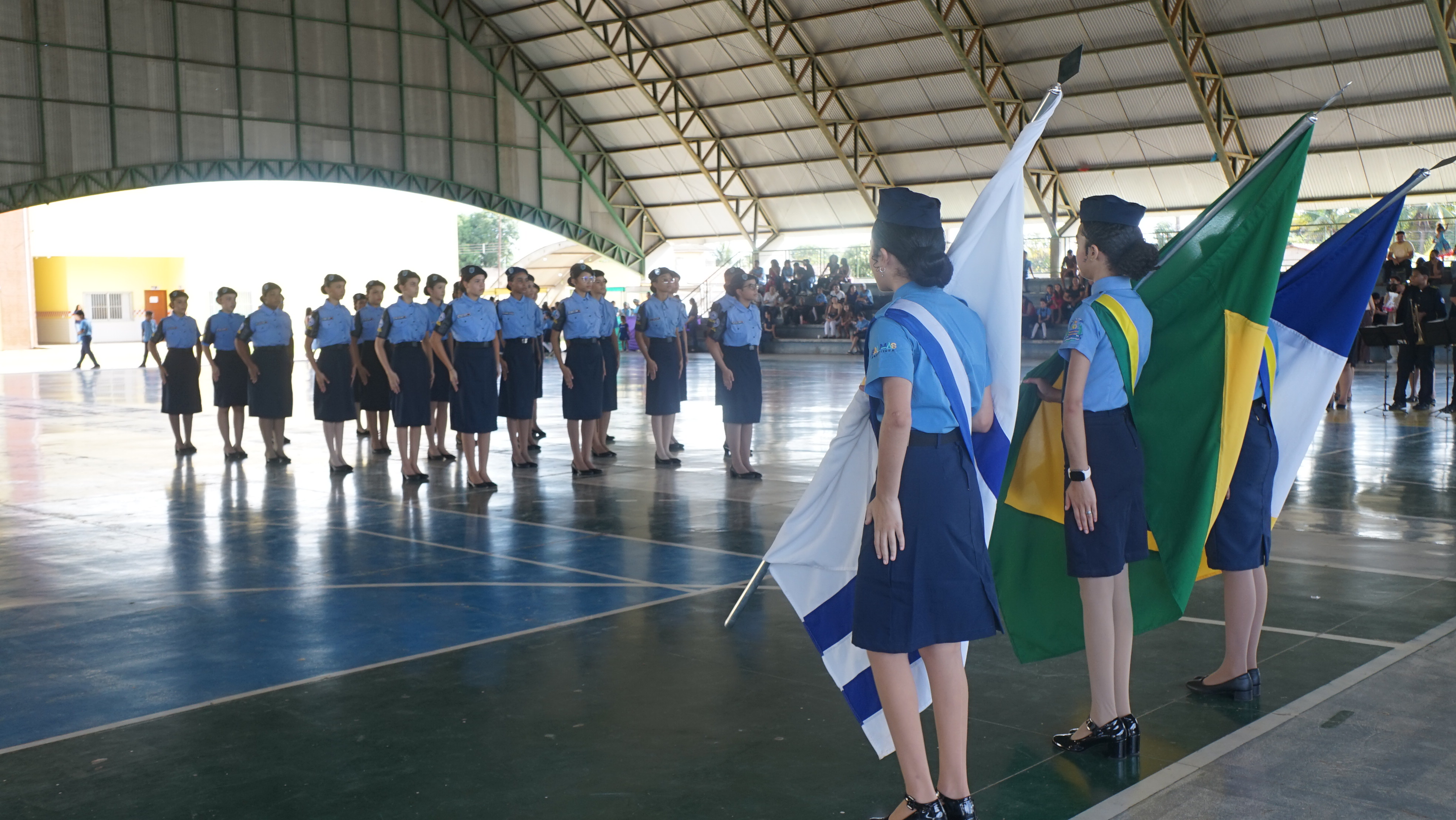 Em um momento especial da cerimônia, familiares entregaram os braçais às formandas, simbolizando o reconhecimento pelo esforço e dedicação durante o curso. Com a conclusão da formação, as novas alunas fiscais passam a colaborar com a equipe gestora da escola no fortalecimento da disciplina e da organização do ambiente escolar, atuando como lideranças entre os colegas e auxiliando no cumprimento do regimento da unidade.