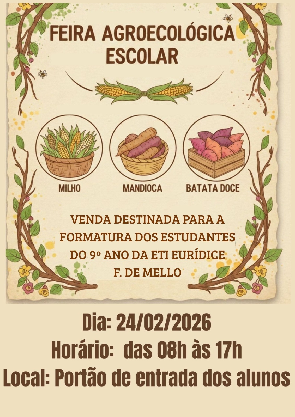 Nesta primeira edição, o destaque são três legumes denominados pelos alunos das turmas de 9º anos da ETI de ‘Trio de Ouro’, sendo eles: milho, mandioca e batata-doce. Além de levar produtos saudáveis para casa, todo o valor arrecadado será destinado à formatura dos estudantes dos 9º anos.