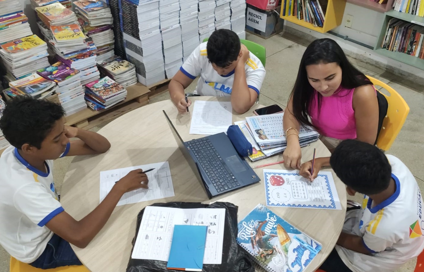 As aulas de reforço acontecem de segunda a sexta-feira, nos turnos e contraturnos. Os estudantes são organizados por nível de compreensão, o que facilita o atendimento às necessidades específicas de cada grupo. O conteúdo segue as habilidades essenciais da Base Nacional Comum Curricular (BNCC) e é trabalhado com fichas de leitura e desafios práticos.