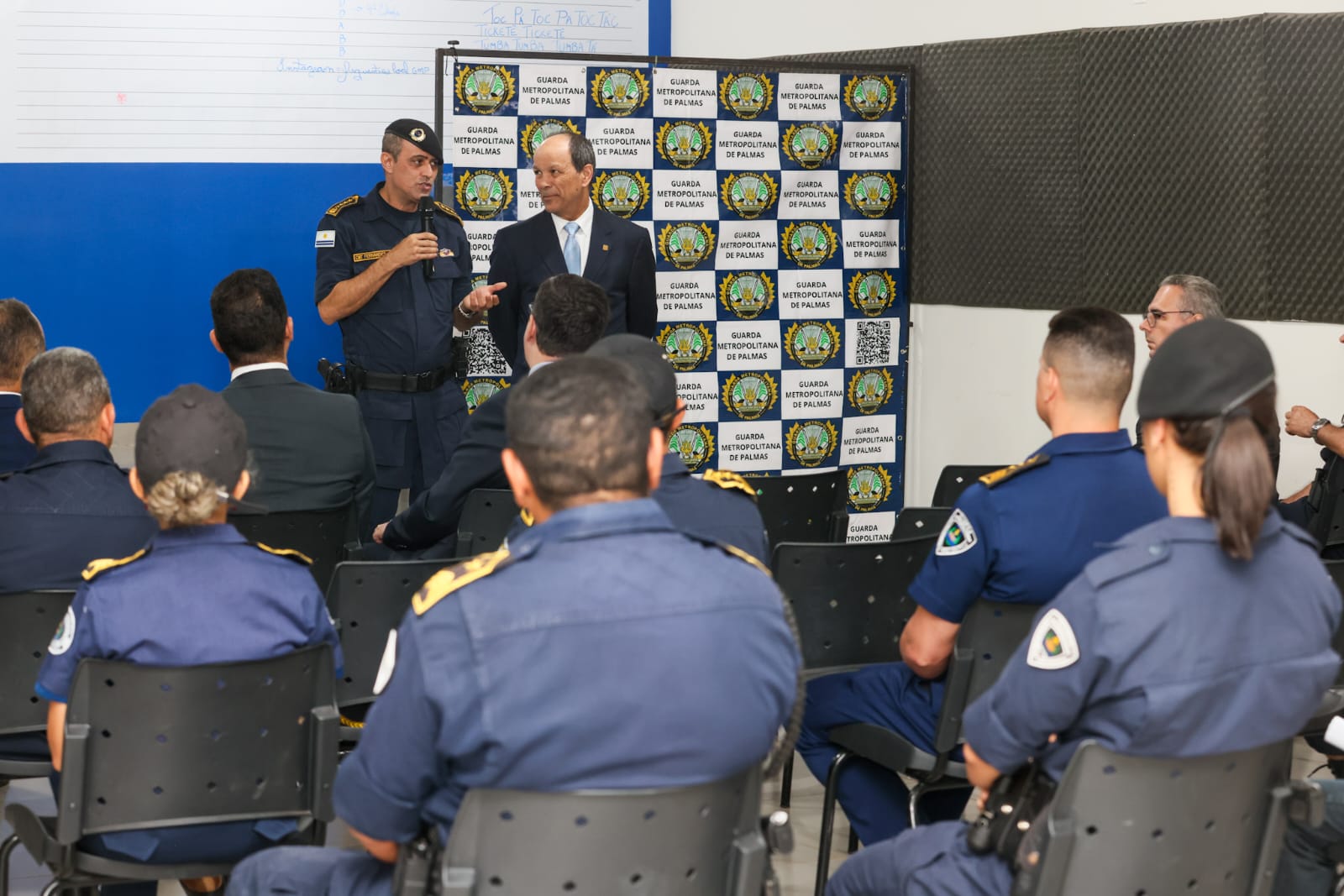 O comandante da Guarda Metropolitana de Palmas, Gilmar Fernandes Cunha, detalhou o funcionamento, a administração e o contingente da guarnição para Jaime de Cassio e outros membros do Ministério Público. Acompanhado pelos titulares da Corregedoria, Recursos Humanos, Financeiro, Formação e Logística, o comandante respondeu aos questionamentos da comissão.