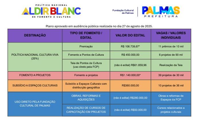 E a outra novidade envolve o recurso que é destinado pela Pnab ao uso direto da FCP. Também ficou decidido que R$ 50 mil do total recebido pela Fundação Cultural de Palmas será direcionado à criação de uma nova linha de investimento que dispensa editais e envolve a promoção de cursos de capacitação na elaboração de projetos culturais.