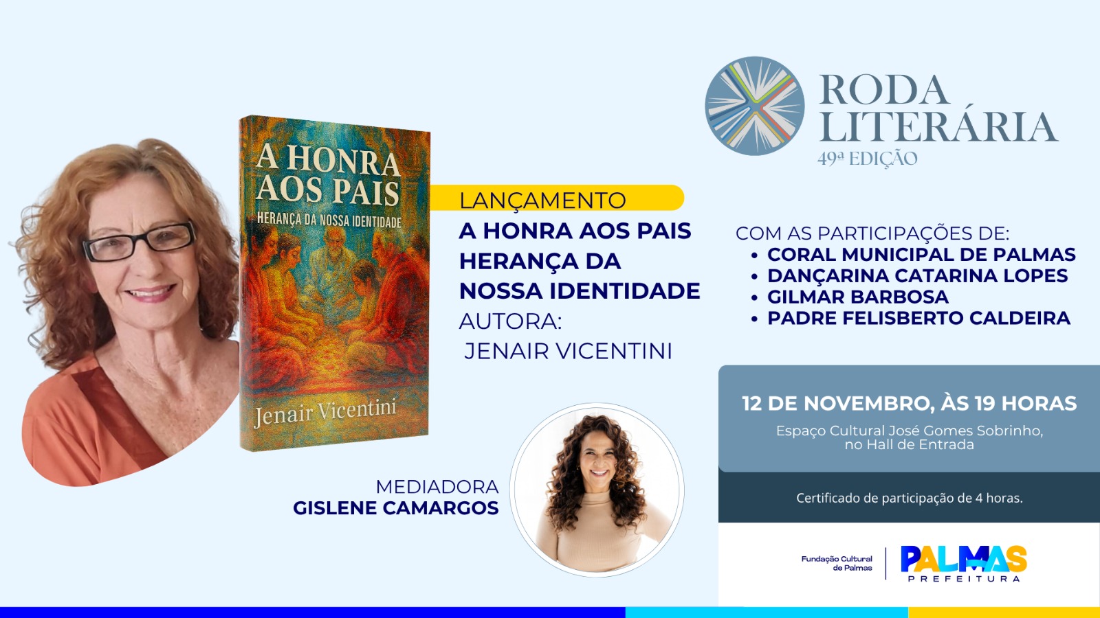 A 49ª edição do projeto Roda Literária, da Fundação Cultural de Palmas (FCP), lança o livro 'A honra aos pais: herança da nossa identidade'. Gratuita, a atividade acontece no Espaço Cultural José Gomes Sobrinho, na Capital, nesta quarta-feira, 12, às 19 horas; e além do bate-papo com a autora Jenair Vicentini, ela também conta com a participação de convidados especiais para esta noite de valoração da arte literária e da cultura.