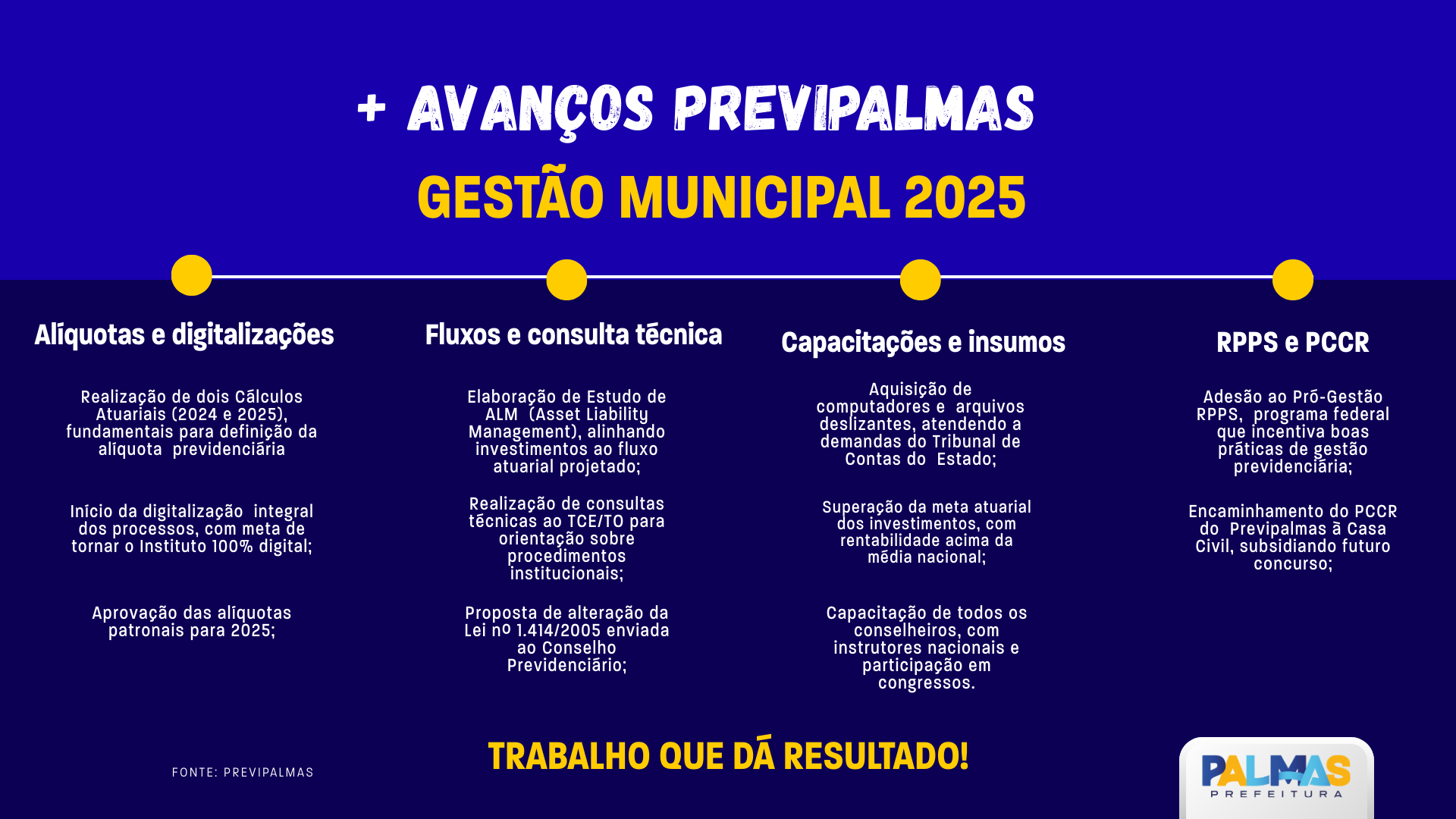 A consolidação das ações de 2025 evidencia o alinhamento do PreviPalmas às boas práticas de governança pública, responsabilidade fiscal e atendimento humanizado. Os avanços alcançados fortalecem a segurança previdenciária dos servidores e reforçam a diretriz de modernização contínua do regime.