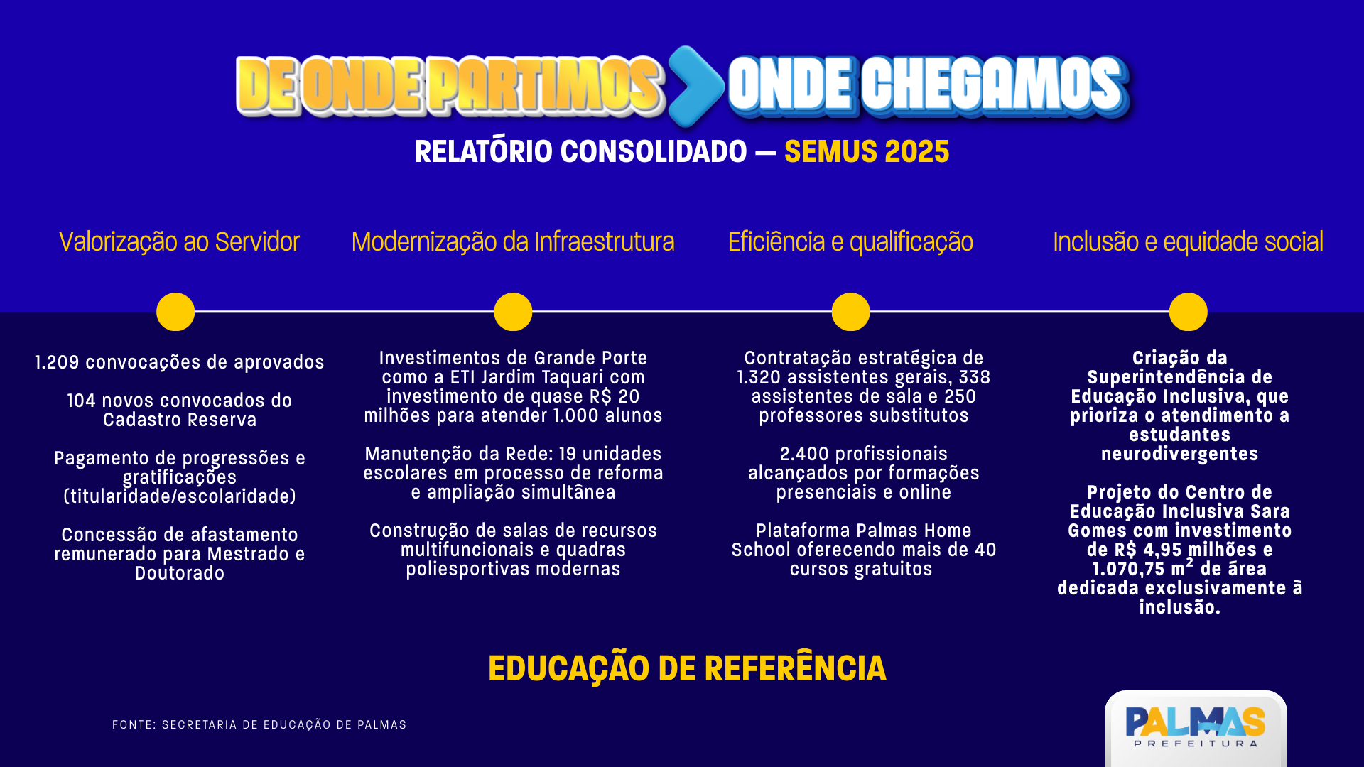 Com essas ações, a gestão atual reafirma seu compromisso com uma educação pública de qualidade, que valoriza os profissionais, amplia o acesso, fortalece a inclusão e garante infraestrutura adequada para o aprendizado. Palmas se consolida como referência em políticas educacionais inovadoras e humanizadas, preparando suas crianças e jovens para um futuro mais justo e sustentável.